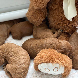 Now that they can see a little, we will start adding select items to the whelping box for them to explore. Appropriately, the Easter Bunny popped in for today’s item! They loved snuggling into the fluff 🥰
